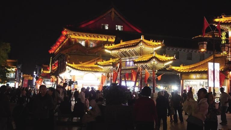 晚9时,在歌舞《领航》的旋律中,台上的演员与台下的市民、游客一起挥舞国旗,歌声、掌声、欢呼声交织成节日的旋律,塞上老街旅游休闲街区成了欢乐的海洋。