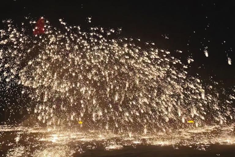 游船靠岸后,另一场盛宴在岸边展开。随着DJ的鼓点响起,电子乐浪席卷全场,市民、游客随着节奏肆意舞动、举手欢呼。最令人惊叹的是,当传承人引燃铁花,千余度的铁水在空中绽放,金红星火如流星坠夜,与现代电子音乐相得益彰。“非遗打火花与现代DJ的同台,象征着传统与现代的对话。”活动策划人苏日娜说,“我们希望通过这种创新形式,让年轻人了解非遗、爱上非遗。”
