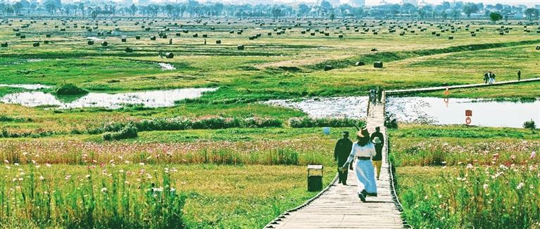 “这里的草卷就像刚出炉的瑞士卷,圆滚滚的,特别治愈。”来自天津的游客陈多多一边拍照一边对记者说,“我们拍了很多照片,根本不用修图,自然光影就很有层次。”她和朋友们在草卷之间穿梭,摆出各种姿势,尽情享受这美丽的风景。