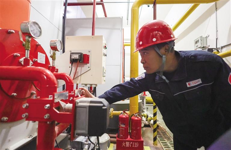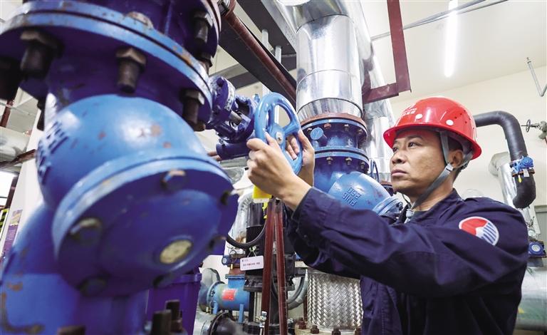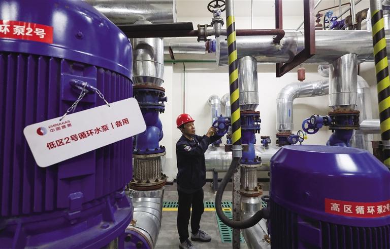 巡检员在燃气锅炉房检查循环泵阀门开启状态。