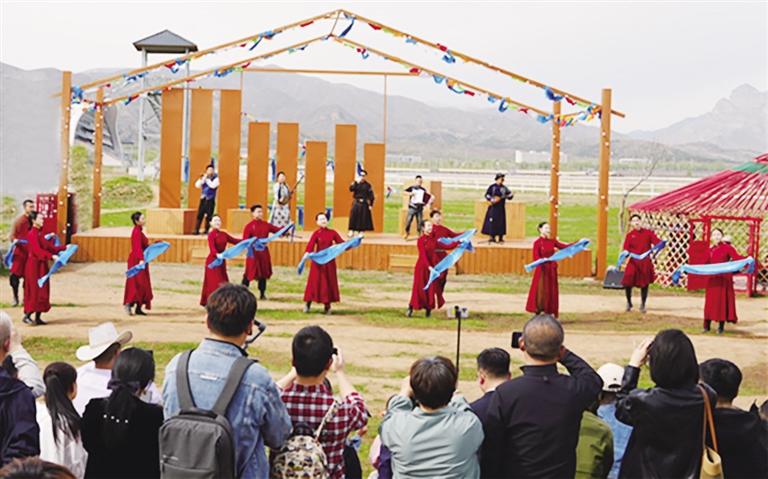 全天候的文化活动让草原热度持续升温。太阳广场的“献给节日的歌·时光音乐会”每日14时准时开唱,经典旋律与草原秋风交融,成为家庭游客的休憩首选。10月1日上午,千人大帐广场的“我爱你中国”歌舞快闪活动点燃全场热情,游客与演员同声合唱,五星红旗在人群中传递。水磨小镇的民宿里,游客跟着村民学做莜面窝窝、体验磨面技艺;星光里的《盛乐星光》演艺项目以现代手法演绎草原历史变迁。夜晚的草原更显迷人,啤酒音乐节的欢歌、文创集市的灯火与蒙古包飘出的奶香交织,篝火旁的安代舞让游客与村民手拉手连成一片。