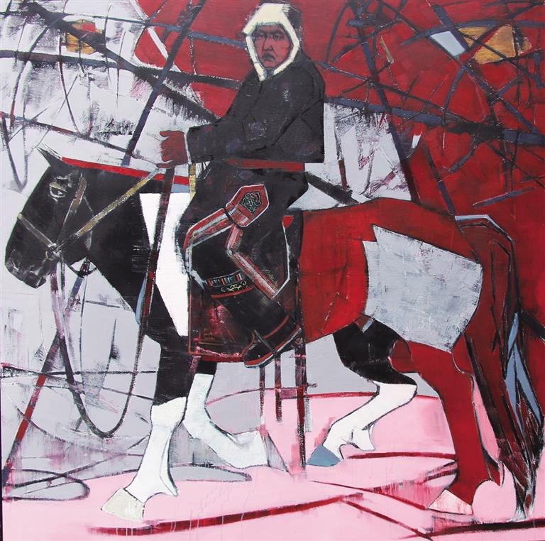 他的绘画形象表现的不单纯是视觉感官的隐喻,而是符号化地记述个人的心灵世界。他从马鞍这种符号中找到了适合自己趣味的表现方式,并试图把整个游牧文化精神浓缩在这个符号里。我们在他的《故乡情》等一系列作品的笔触与轮廓相重叠,平面化与立体空间的组合强烈地感受到真正属于他自己动态思考与想象空间。画家从日常生活中用的马鞍表现了自己对游牧文明急剧变化的复杂感情,那种无奈的心理状态又使我们联想到现代文明之下游牧文明日渐边缘与式微。这正是画家灵魂深处的思考和精神世界的折射。