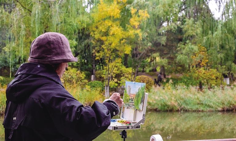 满都海公园内,层林尽染,水光潋滟,吸引不少画家支起画架,用画笔记录醉人秋韵。