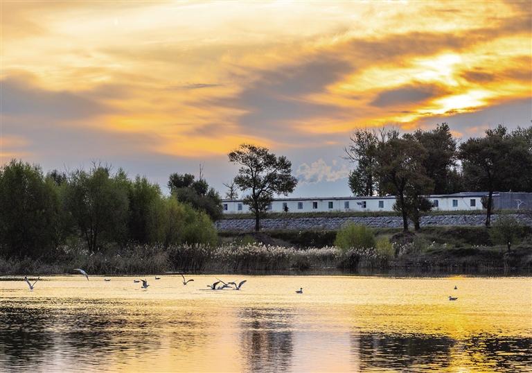 正当人们沉醉于“水天共红”的景致时,一群水鸟突然从芦苇荡中掠过水面。它们或俯身啄食映红的水波,或振翅盘旋于霞光之下,翅膀掠过水面时激起圈圈红波,动静交织间,让这幅静态的“红韵画卷”瞬间鲜活起来。