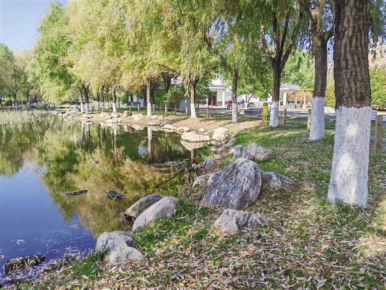 近日,锡林公园内的乔木都穿上了“白衣”。整齐划一的涂白树木与黄绿相间的树叶勾勒出一幅美丽的秋日画卷。