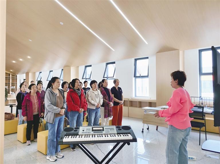 社区老年大学的教室是聚焦“老有所学”的“成长型文化客厅”。为圆中老年群体“音乐梦”,社区开设了声乐课程,吸引30余名爱好者参与。开课前,工作人员提前布置场地,摆放乐谱架与教学资料,营造温馨的学习氛围。授课过程中,老师从基础乐理入手,讲解音符、节奏等知识,并以经典红歌、民间小调为教学载体,通过逐句教唱、发声示范,指导学员掌握呼吸技巧与演唱节奏(见图)。课堂上,银发学员专注记录要点、主动提问请教。“以前在家练习怕吵到邻居,现在有了专门的地方,既能和老伙伴们一起玩音乐,还能认识新朋友,太舒心了!”常来练习的居民张阿姨笑着说。