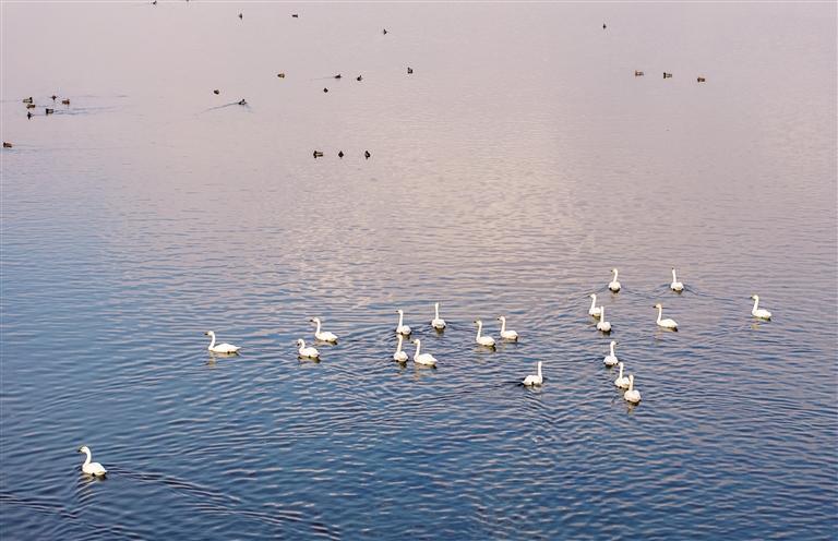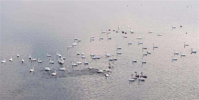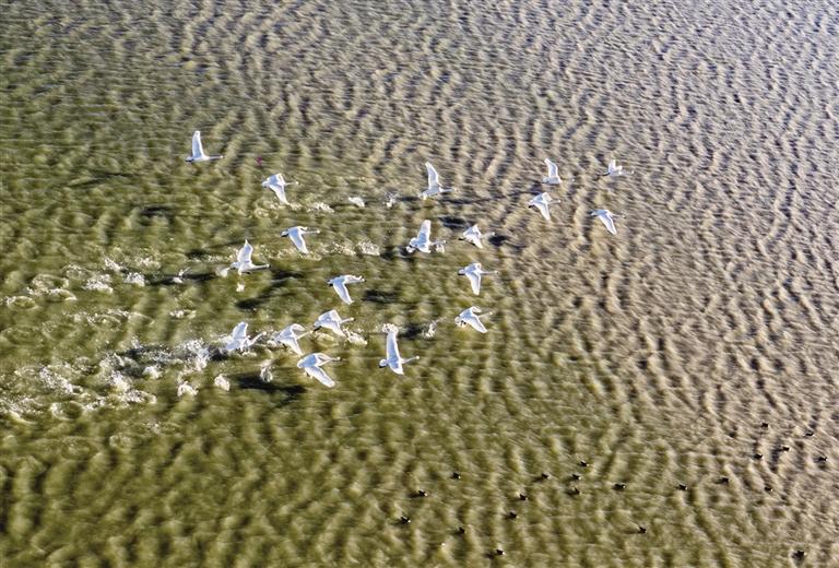 近日,在土默特左旗海流水库,成群的候鸟翩跹而至,在水中悠然休憩、嬉戏游弋,构成一幅和谐的自然画卷。