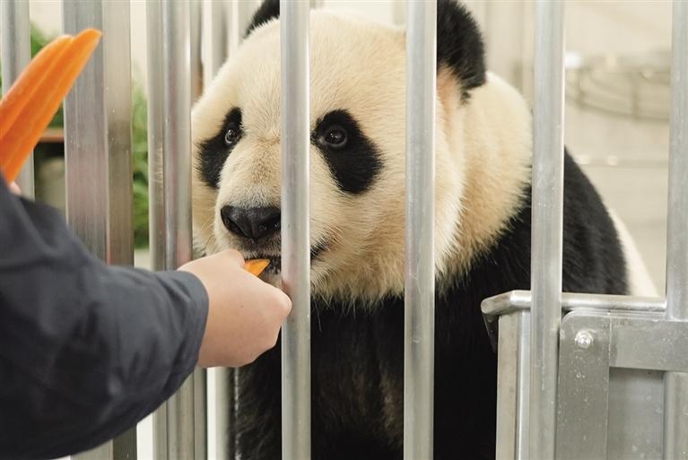 11月4日,在中国大熊猫保护研究中心绵阳基地,饲养员观察大熊猫“苏阳”入住情况。 ■新华社发