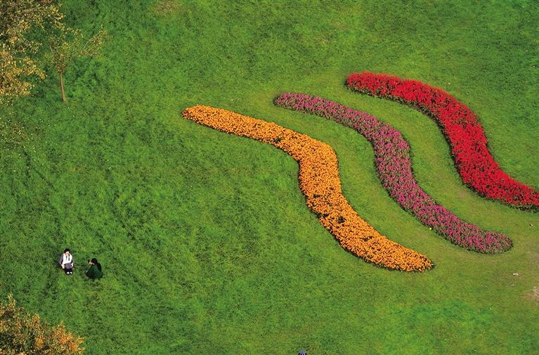 11月3日,游客在江苏省扬州市宋夹城体育休闲公园赏景拍照(无人机照片)。