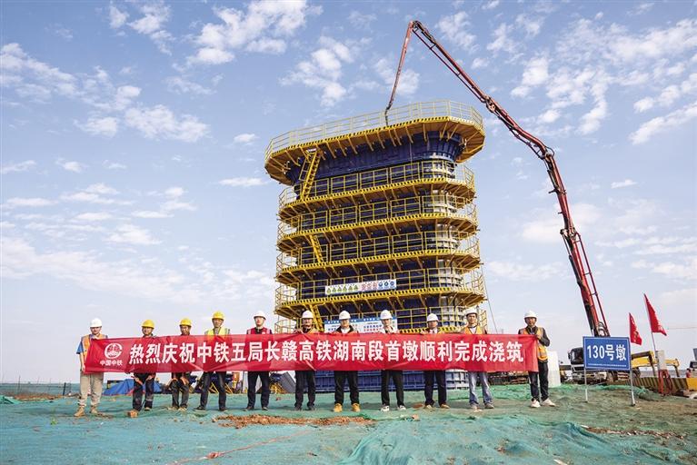 11月5日,在长赣高铁机场高速特大桥施工现场,中铁五局工人在庆祝该项目首个桥墩顺利完成浇筑。当日,由中铁五局承建的长赣高铁关键控制性工程机场高速特大桥130号墩完成混凝土浇筑,这是长赣高铁湖南段首座完成浇筑的桥梁墩柱。长赣高铁连接湖南省长沙市与江西省赣州市,是国家“八纵八横”高铁网之一的厦渝通道的重要组成部分。 ■新华社记者 陈思汗 摄
