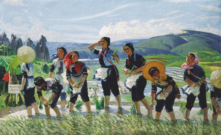 其中让大家记忆深刻的是孙景波先生的代表作之一《阿细新歌》,这幅作品是他1964年从中央美术学院附中毕业后被派往云南工作,在云南农村多年生活经历的基础上创作的。1971年,云南省美术组邀约他创作作品参加全国美展,他便以这段生活经历为素材创作了《阿细新歌》。这幅画作描绘了阿细族姑娘在秧田劳作的场景。画面中,姑娘们在阳光明丽、风轻云淡的田间,有的弯腰插秧,有的抬头欢笑,展现出一派生机勃勃的田园景象。