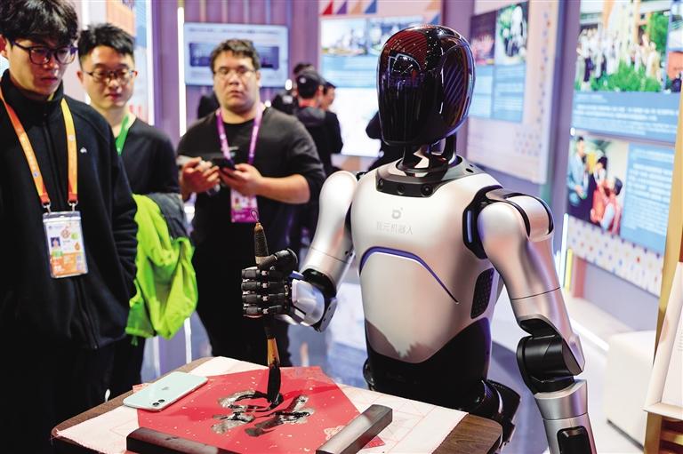 11月5日,人们在第八届进博会国家展中国馆观看机器人使用毛笔写“福”字。