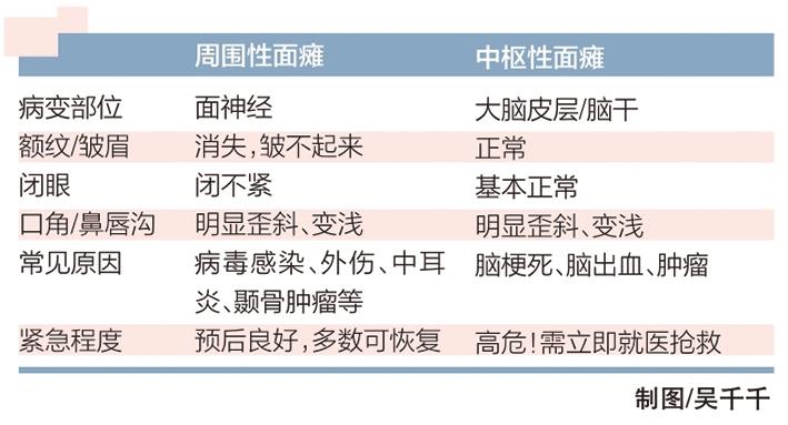 需要提醒的是,任何突发的面瘫,都必须尽快去医院,由医生鉴别是周围性面瘫还是中枢性面瘫,患者切勿自行处置,以免耽误救治时机。
