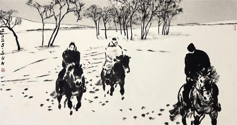 首都师范大学资深教授、博导,中央文史馆书画院研究员,中国画学会理事,中国画马艺术研究会副会长孙志钧先生此次展出的《春风牧马》《冬日牧归》等作品,以草原晨雾、马群、牧人等为核心意象,通过简洁而精准的笔墨传递隽永情感。