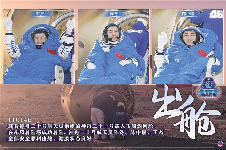 11月14日,载着神舟二十号航天员乘组的神舟二十一号载人飞船返回舱在东风着陆场成功着陆。神舟二十号航天员陈冬、陈中瑞、王杰全部安全顺利出舱,健康状态良好。