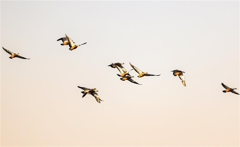 朝阳下成群飞翔的赤麻鸭