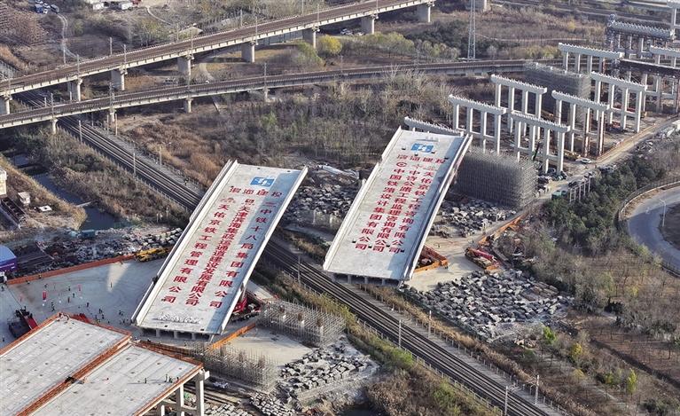 11月26日拍摄的兴港高速上跨津山铁路转体桥施工现场(无人机照片)。
