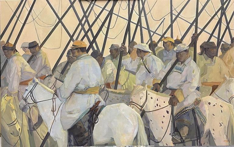 在当代艺术语境下,我始终力求让作品跳出“民族风情画”的审美窠臼,以“生命场域—文化符号—精神史诗”的三层叙事结构,完成对地域文化的深度解码。所谓“西部之光”,从来不是草原上转瞬即逝的自然光线,而是游牧民族在土地与生灵之间,用世代的劳作坚守与文化传承点亮的文明之光——这束光,既是我们的精神图腾,也是艺术创作中永恒的灵感源泉。