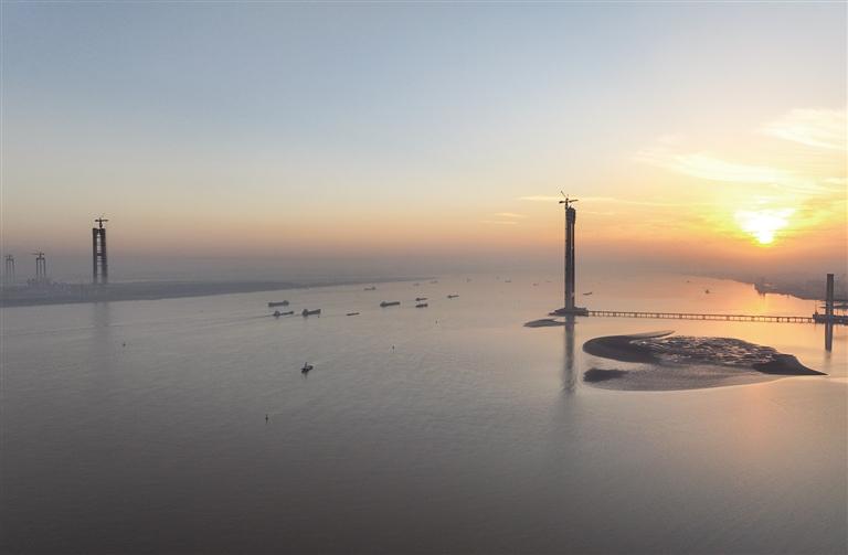日出时分拍摄的张靖皋长江大桥建设现场(11月30日摄,无人机照片)。