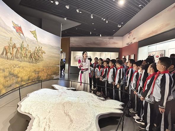 城市发展的脉络与文化传承的温度,同样在这半日时光中徐徐展开。呼和浩特市实验中学鼓楼校区的学生们走进城市展示规划馆,沿着“古今变迁—民俗非遗—未来蓝图”的展陈脉络,借助多媒体互动与沙盘推演,直观感受家乡从古城到现代都市的蜕变,在趣味互动中深化对故乡的认同。五塔寺东街小学的学生们则在呼和浩特雕塑艺术馆上了一堂“立体美学课”,围绕经典雕塑多角度观察、亲手创作,将艺术馆变为动态的“美育工坊”,在感知造型韵律中唤醒审美创造力。新城区海新小学在内蒙古自然博物馆开展生态文明专题课程,从蒙古包“就地取材”、马鞍“实用为先”的传统智慧,到太阳能风车的动手组装,引导学生深刻理解“人与自然和谐共生”的当代价值。玉泉区南柴火市街小学的学生们走进内蒙古昭君博物院(见图),通过观察实物、聆听故事,读懂“昭君出塞”的历史内涵,让“和合共生”的民族交融智慧与民族团结的种子深植于心。
