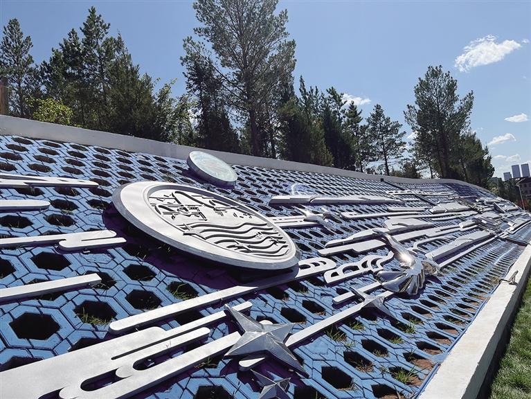 侯也(内蒙古师范大学美术学院副教授)团队的作品《致知笃行 星河远阔》长约200米,宽最高点6.5米、最低点约2米。选用不锈钢、马赛克镶嵌、玻璃等材质工艺。该壁画是为鄂尔多斯应用技术学院而作,作品以时间为轴串联校史重要节点,将核心专业元素嵌入山水云星景致间。画面中,“长河”奔浪叠刻十年奋进足迹,岳脊凌云托举学科硬核实力,云卷星垂铺展浩瀚探索视野。“鄂小鹰”振翅穿云、掠过长空,既是学子的生动象征,更呼应“鹰击长空”的精神内核。整体以“致知”凝治学初心,用“笃行”承育人使命,既镌刻十年深耕的厚重底蕴,更绘就学子承校训、逐苍穹的壮阔图景。