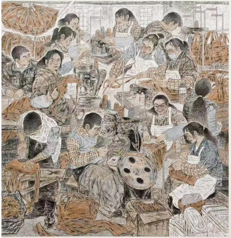 作者名称: 《三来一补逢时节——记东莞第一家手袋厂》(合作) 作者姓名: 席卫权 孙玉宝 柴溪 作品尺寸: 240cm×230cm 作品类型: 壁画 创作年代: 2025年
