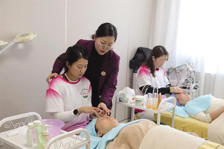 本报讯(记者 祁晓燕 通讯员 马子璇)走进回民区“敕勒川妈妈学堂”,浓郁的学习氛围扑面而来。美容实操室里,面部按摩课的学员们两两结对实操,跟着老师的示范拿捏力度、顺循经络,从额间到下颌轻柔推拿,不时互相询问“这个手法是不是到位了”,脸上满是认真与专注(见图);化妆课上,大家手持化妆刷反复练习底妆均匀度,笔尖划过之处,是对精致技艺的追求;美发工作台前,假发模型旁围满了人,剪刀与梳子默契配合,剪发、烫染、编发等技巧在指尖流转,不时有学员举起作品互相点评,眼里满是求知的迫切……全程免费的培训模式,让学员无需顾虑成本,全身心沉浸在技能提升的快乐中。