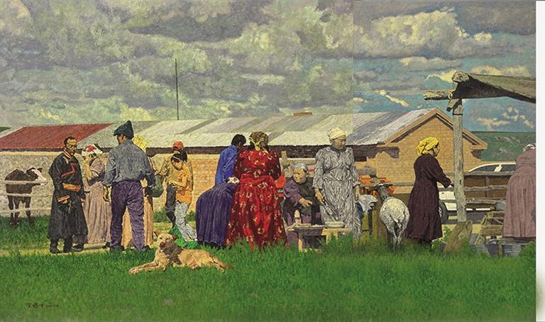 王耀中教授的油画新作《宜居宜业新家园》,以“传统牧区现代化转型中的生态人文重构”为核心主题,运用较大的画幅、厚重的笔触、丰富的色彩,展现了牧区在现代化进程中的深刻转型和时代风貌。他在创作立意上,围绕“生态宜居”与“产业兴旺”展开,通过油画艺术对自然光与色的捕捉,呈现祖国北疆山河的壮美绚丽与牧区生活现状的和谐景象,旨在展现牧民为实现共同富裕的热情和愿景。