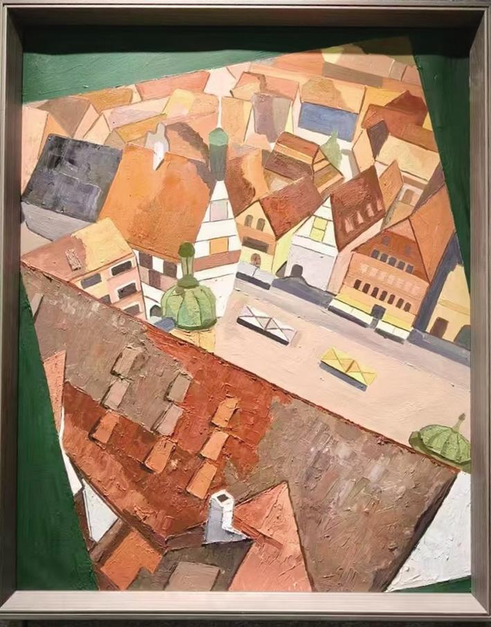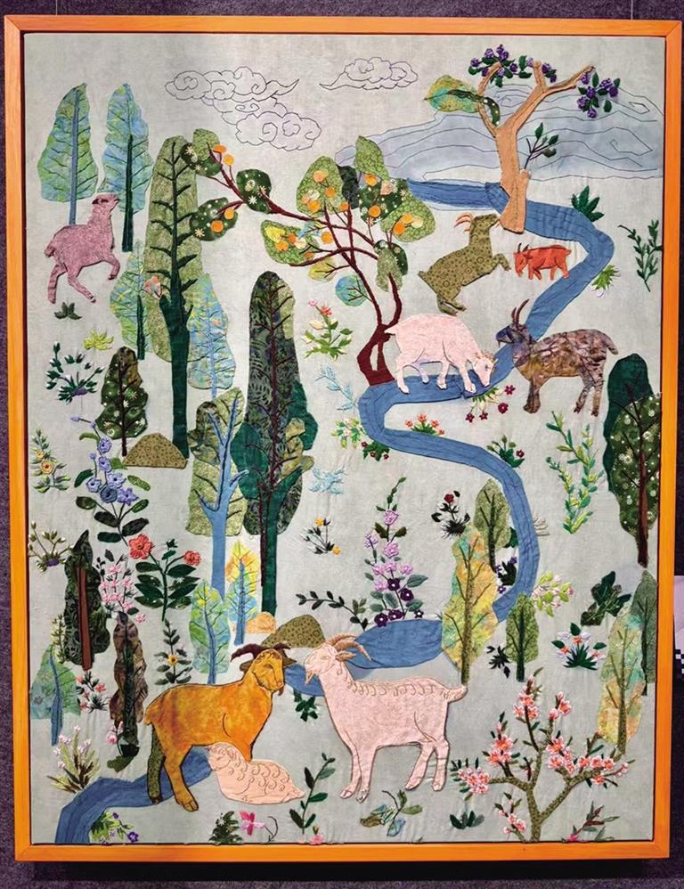 展览作品中不乏亮点,中国画《溪山妙境传清音》《翠峦叠嶂隐幽居》,展示了中国画传统青绿山水的魅力;水彩《温柔的时光》则呈现了点滴生活中,光阴流转积攒岁月的痕迹;油画《被时光磨钝的铁皮诗》机械制造上时代发展、技术更迭留给生命的感动;油画《斜方小镇》放下了纯粹的焦点透视美学,重构了心中的美景宜居家园。而《快乐草原之春》是一幅充满生机的布艺拼贴与刺绣结合的装饰画,以浅青为底色,通过丰富的布料拼接、刺绣纹理,构建出一片灵动画意的山林溪谷:蜿蜒蓝溪穿林而过,各色树木层叠错落,点缀着缤纷花草;多只形态各异的山羊或闲步、或饮水、或休憩,色彩明快柔和,既保留了手工材质的温暖质感,又以童趣化的构图传递出自然生态的悠然意趣,是传统布艺与现代装饰美学的巧妙融合。