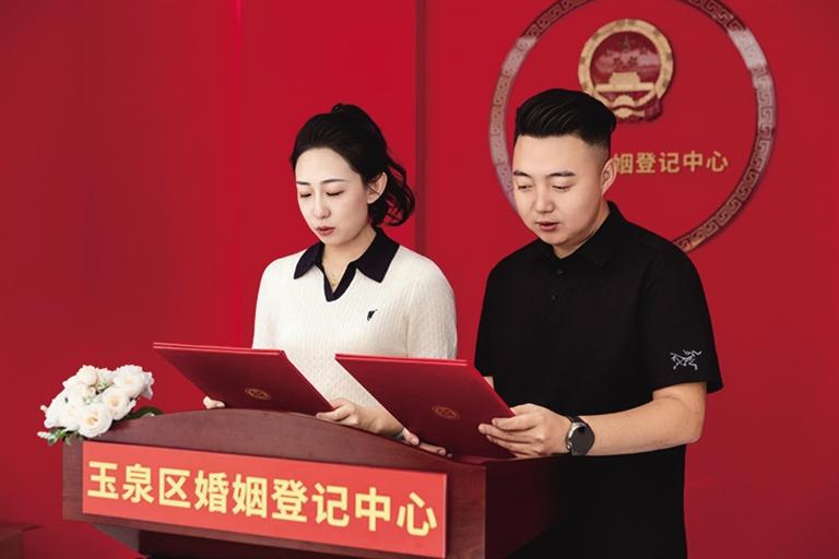 玉泉区婚姻登记中心设有登记厅与宣誓厅,可提供婚姻登记、宣誓颁证等“一站式”服务。中心践行婚姻登记“全国通办”政策,为外省新人提供便捷服务,还配套婚姻家庭辅导,助力新人树立健康婚恋观。玉泉区婚姻登记中心工作人员介绍:“我们将以专业贴心的服务,引导新人沉浸式感受传统婚俗文化的魅力,让领证不仅是一道法律程序,更成为一次值得铭记一生的文化体验。”