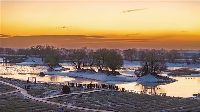 冬季的呼和浩特市千岛湖银装素裹,湖区被皑皑白雪覆盖,天地间尽是北方冬日独有的澄澈与静谧。清晨,一轮朝阳挣脱地平线的束缚,自天边缓缓升起,金色霞光洒向湖面,光影流转间,天地一派清透空灵。千岛湖的日出美景也吸引了大量的市民和外地游客前来观赏。 ■本报记者 王劭凯 摄