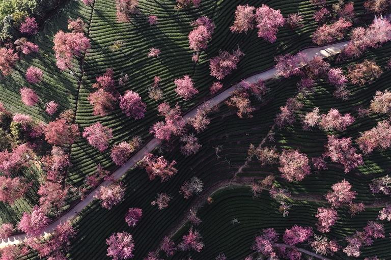 进入12月,云南省大理白族自治州南涧彝族自治县无量山樱花谷的冬樱花陆续绽放,与茶园、云海构成一幅美丽的山水画卷。