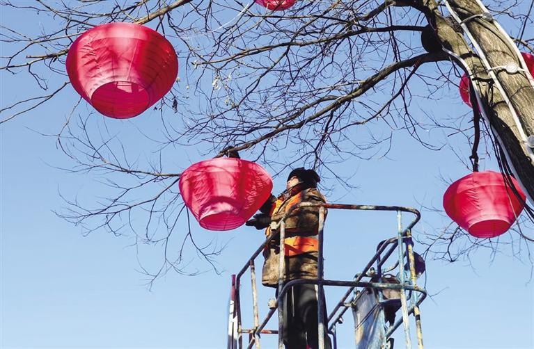 近日,工作人员正在大南街街边的树木上挂装红灯笼。