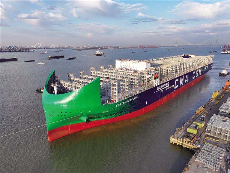 据悉,该船由江苏扬子江船业集团自主研发建造,船舶总长399.9米、型宽61.3米、型深33.5米,可装载24212个标准集装箱。