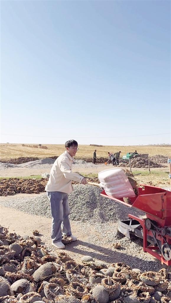 他决定送学生回家。几十分钟的车程,他们来到了武川县的一个村庄。眼前的情景让这位年轻教师怔住了:院子里堆满待处理的葵花,学生的父亲正艰难地劳作。王雁升立刻卷起袖子,加入了“脱葵花”的队伍。