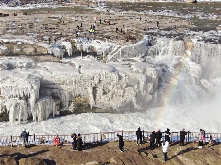 1月6日,游客在山西吉县黄河壶口瀑布景区欣赏“冰瀑玉壶”和彩虹景观(无人机照片)。