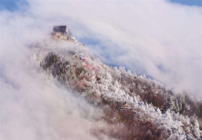 连日来,湖南省衡阳市南岳衡山风景区出现雾凇云海景观,壮美如画的景色吸引众多游客前来观赏游玩。