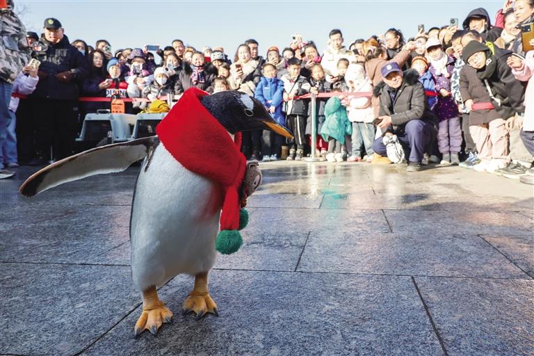 1月13日,在2026第五届呼和浩特欢乐冰雪节期间,几只广受欢迎的南极巴布亚企鹅走上青城街头,与市民见面。在专业人员的引导下,一只企鹅迈着小碎步悠闲漫步,憨态可掬的模样令众多“粉丝”为之倾倒。它每到一处便四处溜达、左右打量,呆萌的姿态吸引了众多市民驻足。“实在太可爱了,我还是第一次见到真正的企鹅!”市民刘女士激动地说。