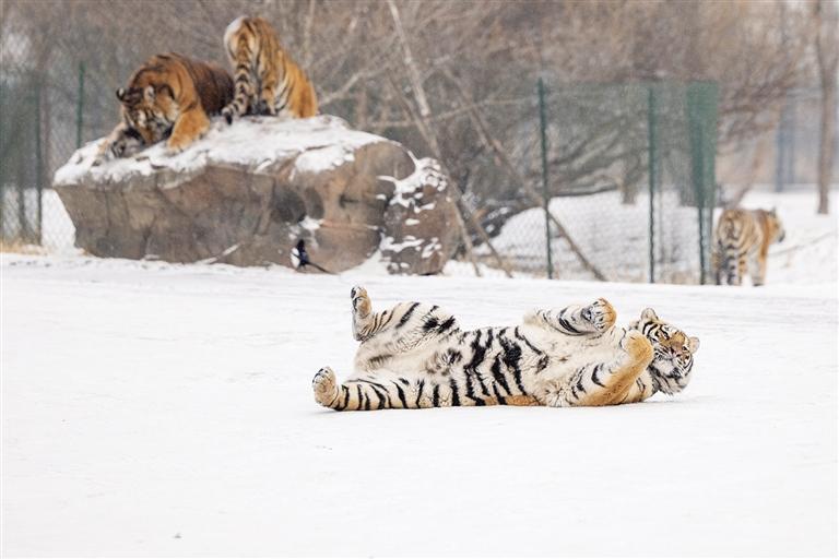 1月12日,冰城哈尔滨市迎来降雪天气,在黑龙江东北虎林园,散放区的东北虎在雪地活动。