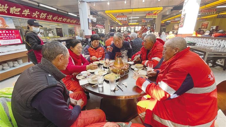 环卫工人们围坐在一起,一边品尝美食,一边与工友们畅聊。氤氲的热气模糊了门窗,也温暖了每个人的心房,整个火锅店里充盈着欢声笑语。
