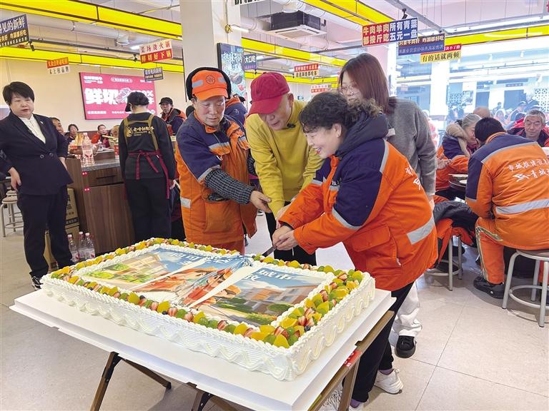 从1月18日至20日每日中午,忙碌了一上午的环卫工人陆续走进店内。滚烫鲜香的锅底已然备好,新鲜食材整齐码放在餐盘里,热气腾腾的饺子端上了桌,还有特意定制的印着“向可敬可爱的城市美容师致敬”字样的巨型蛋糕,每一处细节都藏着满满的诚意。