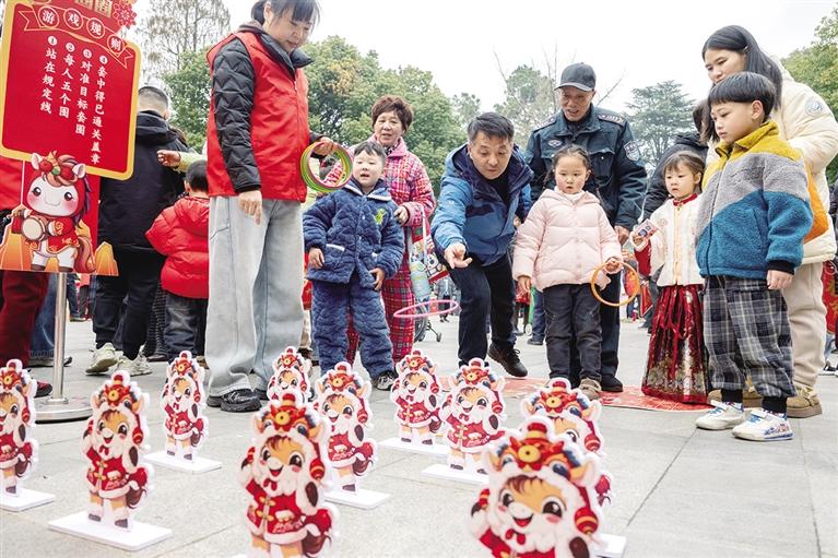 2月4日,在浙江省湖州市长兴县雉城街道古城公园,社区居民参与“马年套圈圈福气”趣味体验活动。