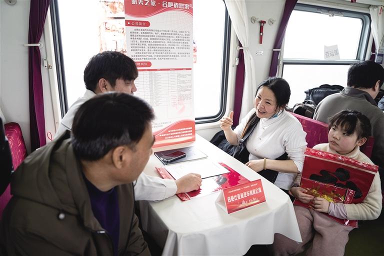 当日,由中国铁路上海局集团有限公司合肥客运段联合合肥市人力资源与社会保障局举办的列车招聘会在上海站开往阜阳站的K8362次列车上举行,为返乡游子架起就业对接的桥梁。