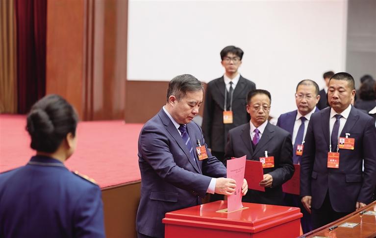 2月12日下午,市十六届人大五次会议第三次全体会议上,参会代表正在投票。