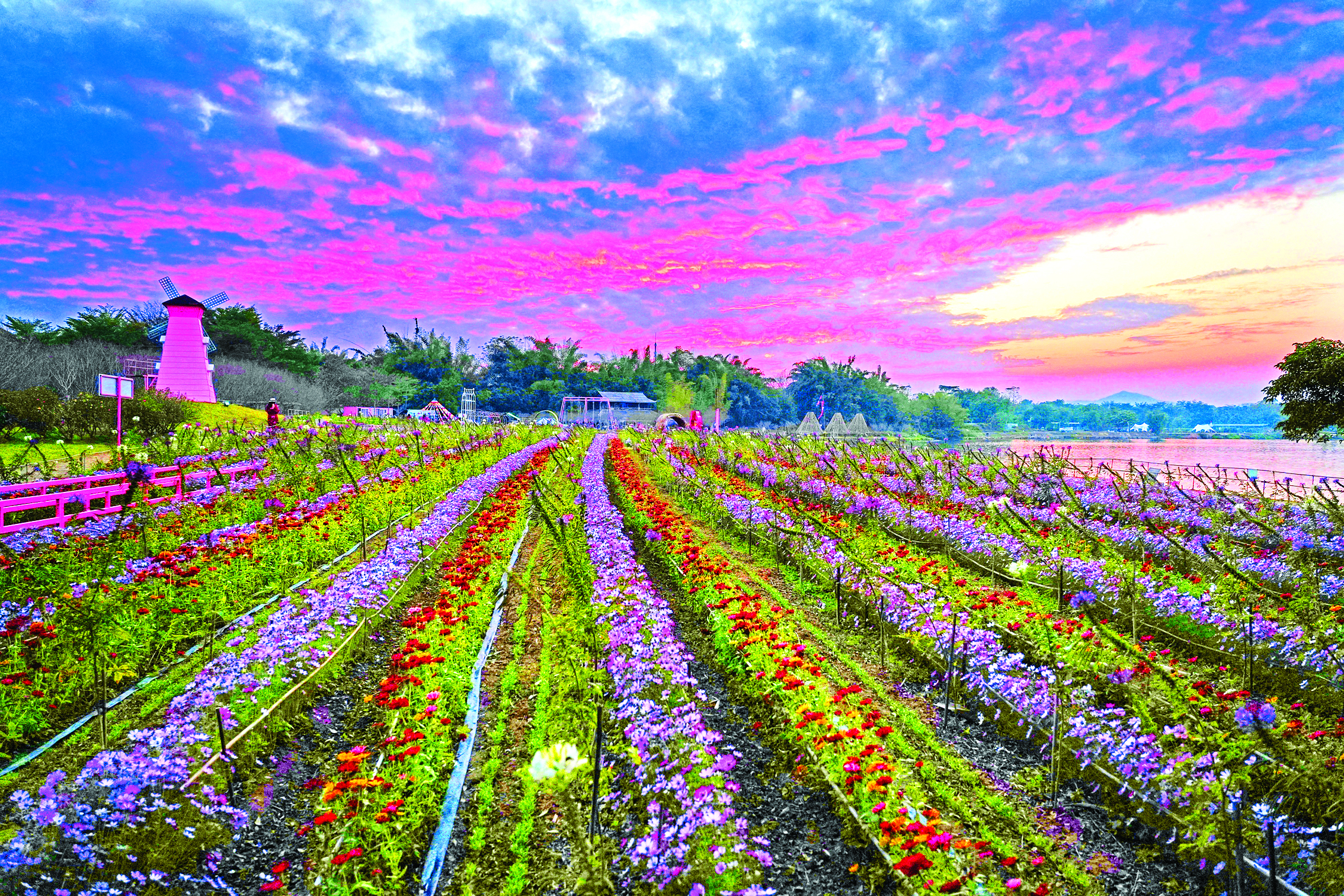 上月31日傍晚,惠州西枝江畔的三栋镇紫溪半岛出现了美丽的晚霞。夕阳缓缓沉入地平线,晚霞映红了半边天。云层如同燃烧过一样,金黄、橘红、粉红、紫色交织在一起,变幻无穷,美不胜收。