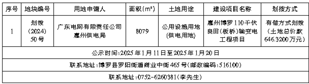 经博罗县建设用地领导小组2024年第19次会议讨论决定,拟将位于博罗县泰美镇良田村下一经济合作社、新塘村奎岭经济合作社位于长坑(土名)地段的1宗国有建设用地使用权以有偿划拨的方式供给有关单位,有关情况公示如下: