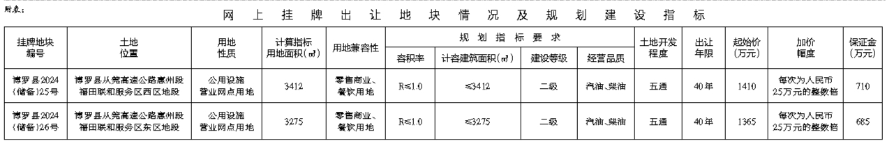 根据《招标拍卖挂牌出让国有建设用地使用权规定》(国土资源部令第39号)和《广东省国有建设用地使用权交易市场管理规定》(广东省人民政府令第304号)的规定,经批准,我局决定以网上挂牌方式公开出让下列两宗国有建设用地使用权。[公告具体内容请登录惠州市公共资源交易中心土地与矿业挂牌电子交易系统(https://tdky.hzggzyjy.cn/]。