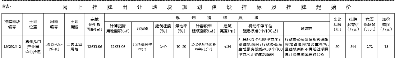 根据《招标拍卖挂牌出让国有建设用地使用权规定》(国土资源部令第39号)和《广东省土地使用权交易市场管理规定》(广东省人民政府令第304号)的规定,经批准,我局决定以网上挂牌方式公开出让1宗国有建设用地使用权。[公告具体内容请登陆惠州市公共资源交易中心土地与矿业网上挂牌交易系统(https://tdky.hzggzyjy.cn/)]