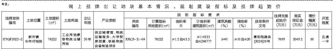 根据《招标拍卖挂牌出让国有建设用地使用权规定》(国土资源部令第39号)和《广东省国有建设用地使用权交易市场管理规定》(广东省人民政府令第304号)的规定,经批准,我局决定以网上挂牌方式公开出让下列一宗国有建设用地使用权。[公告具体内容请登录惠州市公共资源交易中心土地与矿业挂牌电子交易系统(https://tdky.hzggzyjy.cn/)]。
