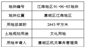 经研究,我局拟将惠城区江南地区01-06-05地块部分国有建设用地使用权划拨供应给惠城区机关事务管理局,该宗地用地总面积2443平方米,作为西湖文化中心项目用地,土地用途为文化用地。